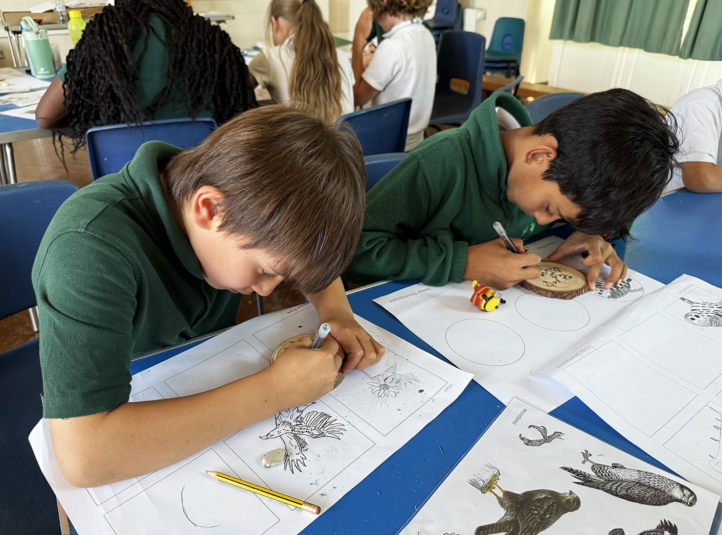 More than 70 children explored the area’s rich identity through themes such as local habitats, Iron Age heritage and historic pathways. Using drawing, design, metal embossing, timber slice illustration, and simple book-making, the pupils created thoughtful and playful artwork that will directly inform the final public art across the site.
